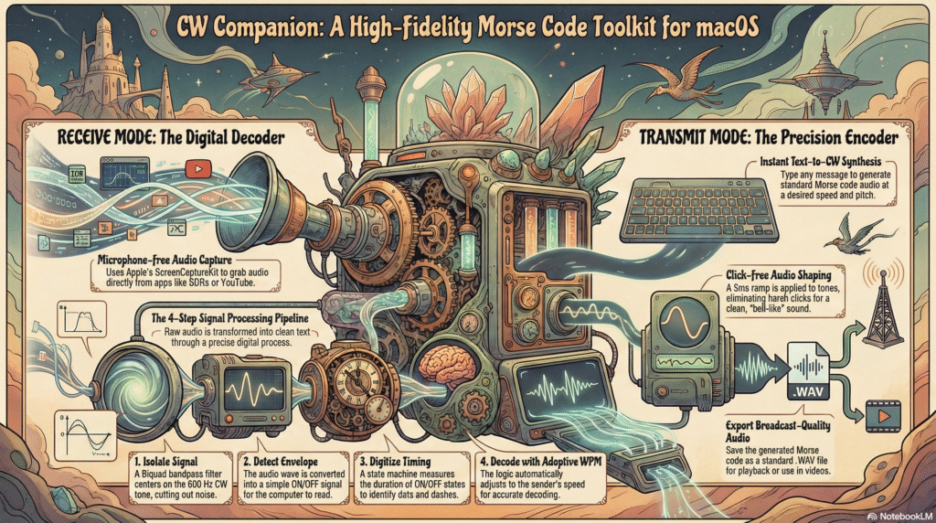 The technical power of CW Companion relies on a strict linear DSP (Digital Signal Processing) pipeline built on Swift 5 and modern macOS frameworks.