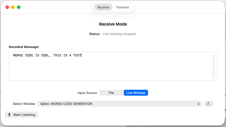 .wavfiles. The application scans the file, estimates the sender’s speed (WPM), and provides a full text decode. - Visual Feedback: As characters are detected and decoded, they appear in real-time on the interface.