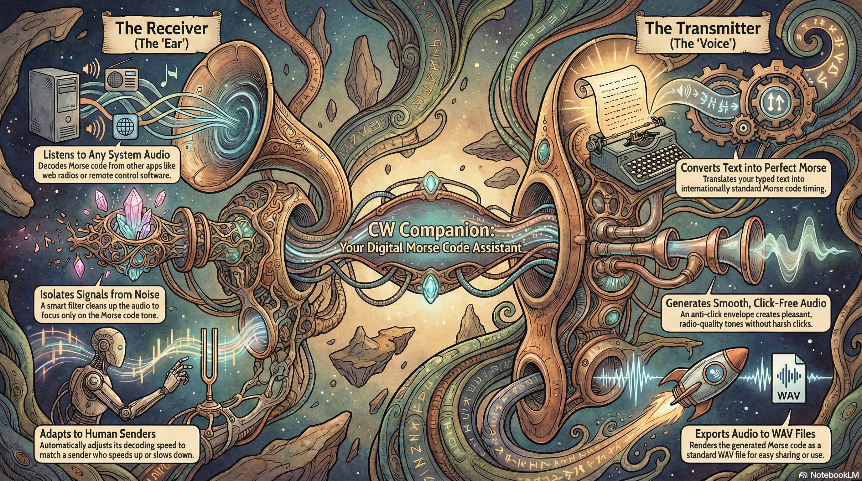 - Text-to-CW: Users can convert typed text into standard International Morse Code audio.