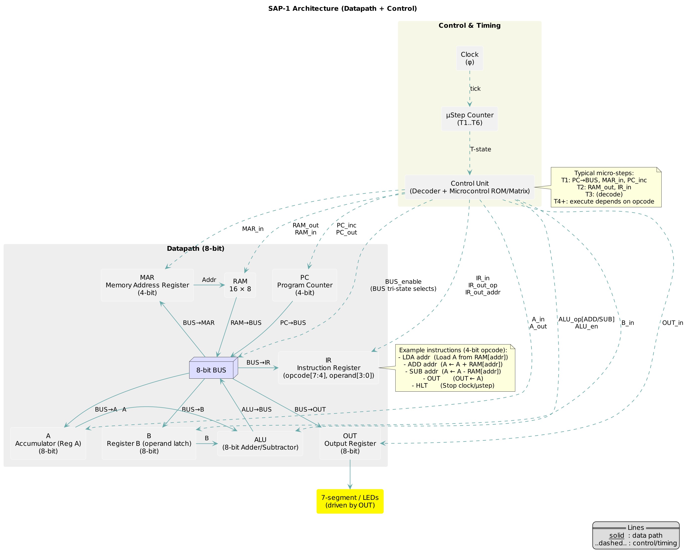 My SAP-1 is an 8-bit accumulator machine with a 4-bit opcode and a 4-bit operand (address) packed into a single 8-bit instruction. It uses a 16-byte instruction/data memory. Core parts: