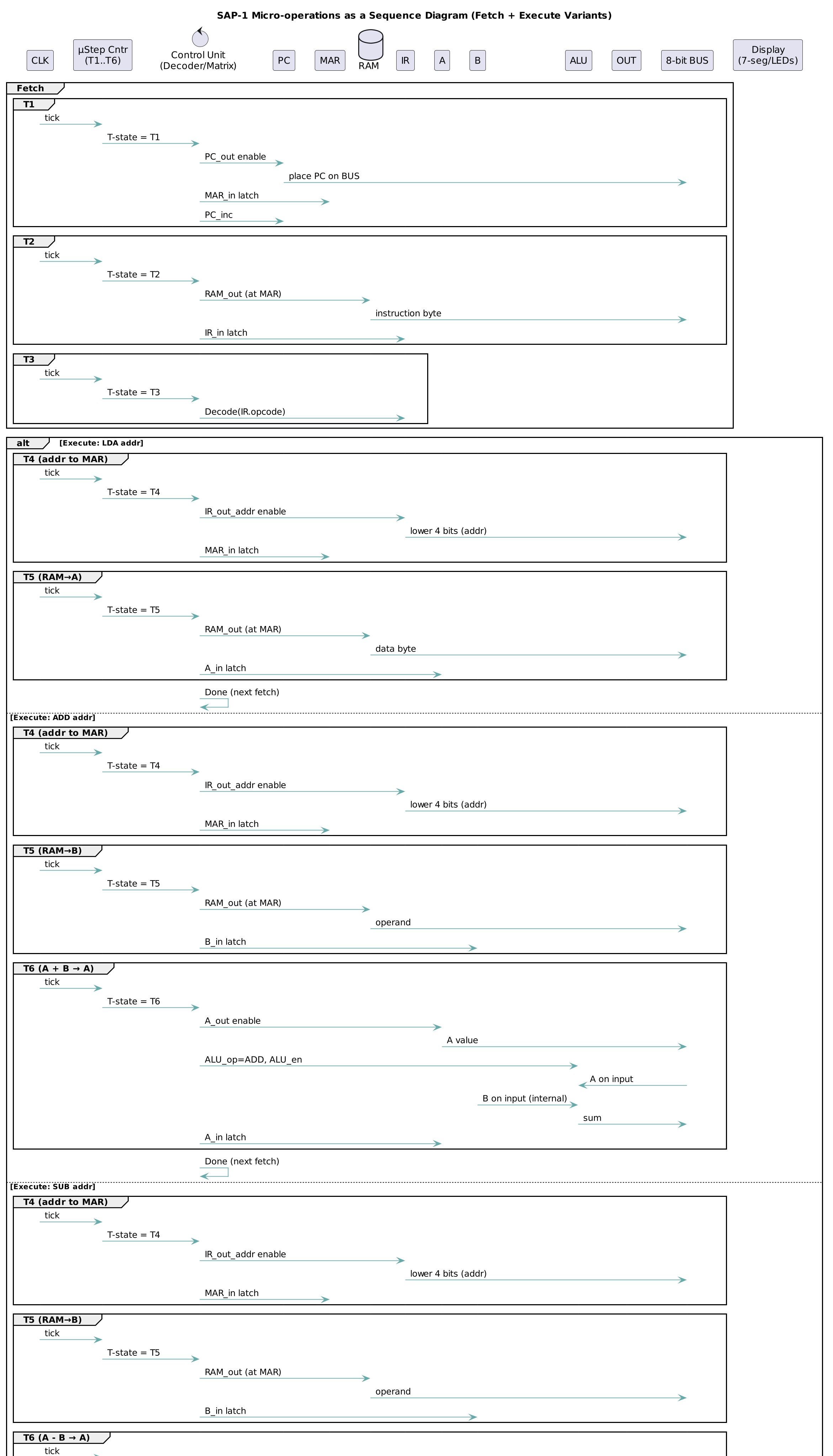 , optional tiny RAM for constants. - Control: a simple micro-step sequencer (T0..T5) that asserts control signals for fetch/decode/execute.